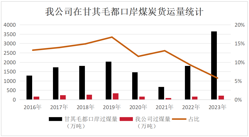 跨境運(yùn)輸是蒙煤集團(tuán)所有業(yè)務(wù)的起點(diǎn)、也是我公司較有競(jìng)爭(zhēng)力的板塊。2019年,我公司在甘其毛都口岸的煤炭貨運(yùn)量為340萬(wàn)噸,占甘其毛都口岸煤炭貨運(yùn)量的17%;2020年和2021年,甘其毛都口岸的貨運(yùn)量整體下滑,但我公司仍保持甘其毛都口岸煤炭貨運(yùn)量的占比超過(guò)13%。2023年,我公司在甘其毛都口岸的煤炭貨運(yùn)量為210萬(wàn)噸,占甘其毛都口岸總量的6%。自2016年以來(lái),我公司在甘其毛都口岸的累計(jì)煤炭貨運(yùn)量達(dá)1655萬(wàn)噸,平均占比達(dá)11%。
